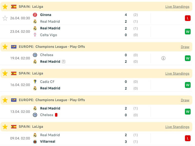 Trong 10 lần gặp gỡ trong quá khứ, Real Madrid áp đảo hoàn toàn với 9 chiến thắng và chỉ có duy nhất 1 trận hoà. Trận đấu này dự báo sẽ là thế trận 1 chiều và chiến thắng dĩ nhiên sẽ thuộc về đội chủ nhà.