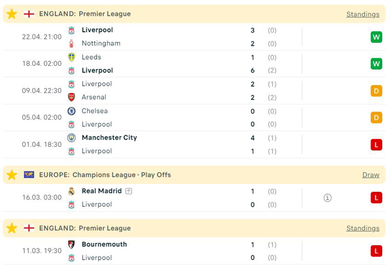 Phong độ thi đấu giữa West Ham vs Liverpool